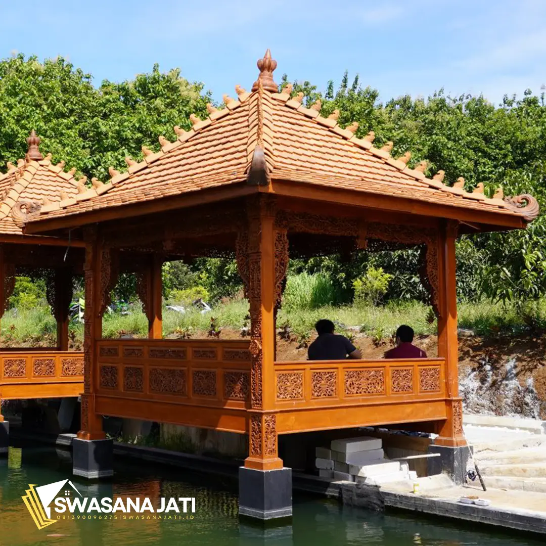 Gazebo Joglo Minimalis merupakan produk spesial kami yang memiliki desain yang memadukan gaya tradisional Joglo Jawa dengan konsep minimalis modern agar terlihat lebih menarik. Gazebo ini meliputi: atap yang mengikuti model Joglo dengan puncak mendatar (tajug), struktur kayu yang bersih dan minimalis, serta penggunaan material kayu seperti jati atau mahoni. Memiliki warna natural menjadikan lokasi yang ditempati menjadi lebih alami serta indah.