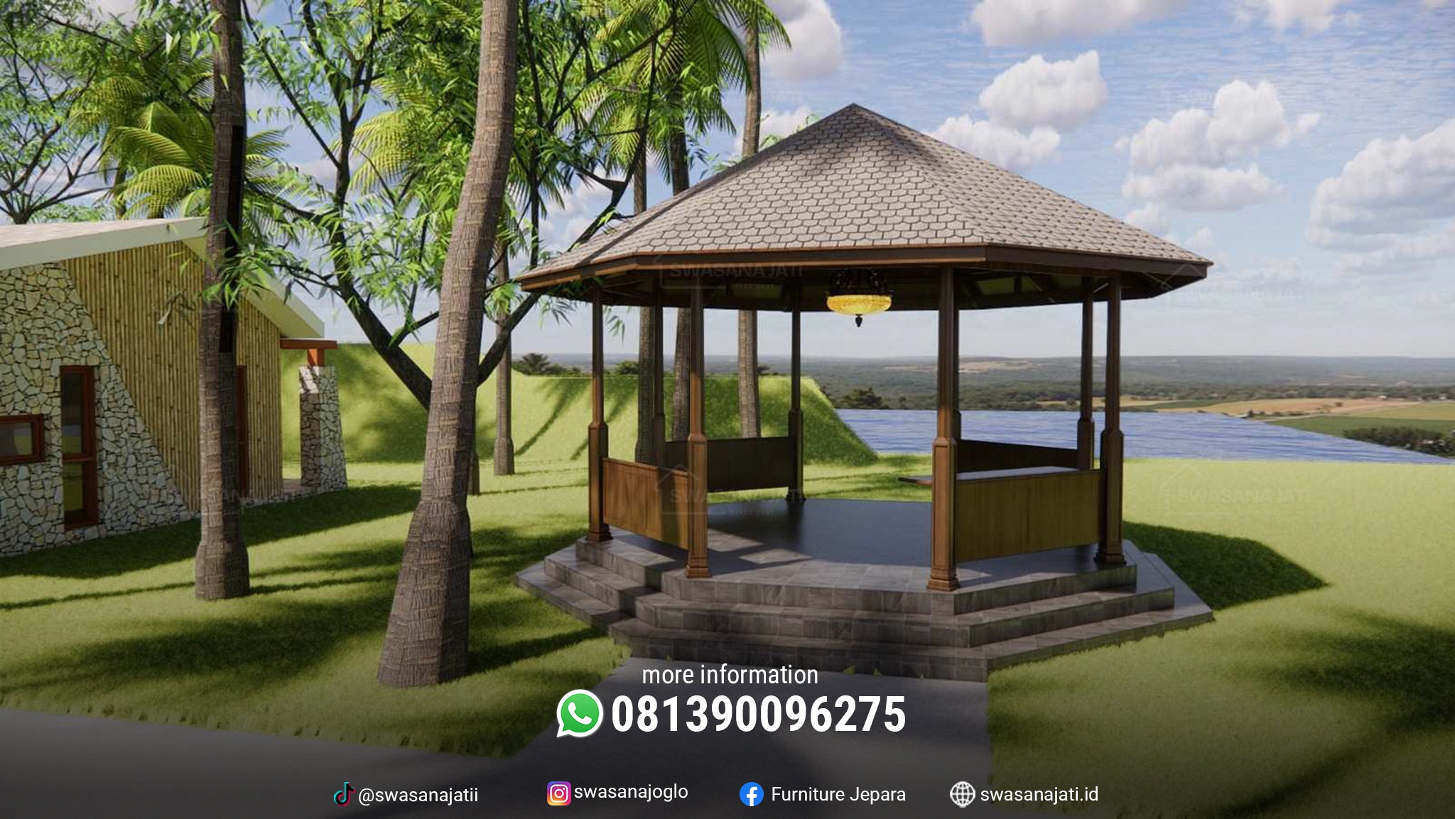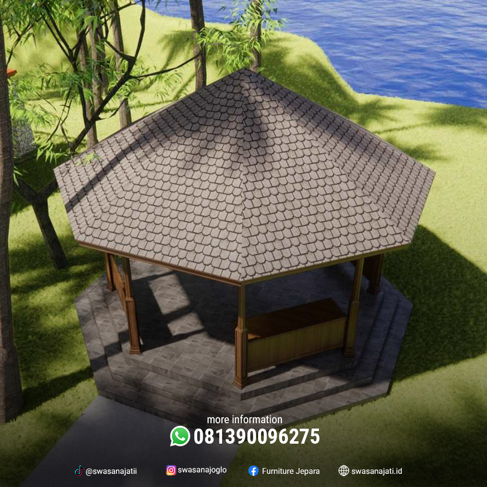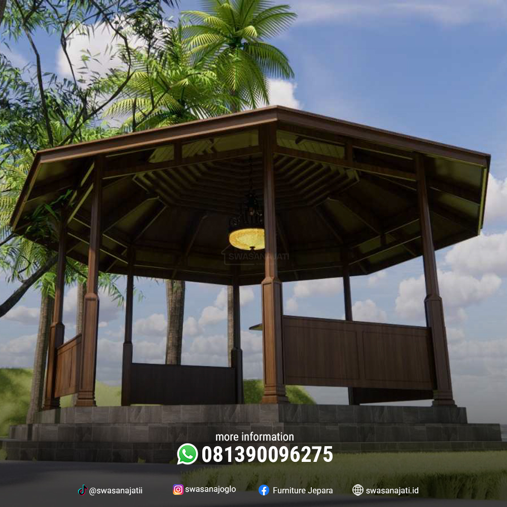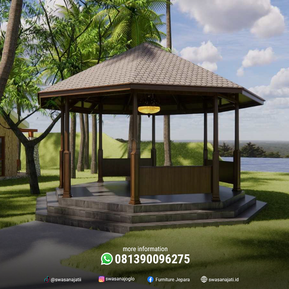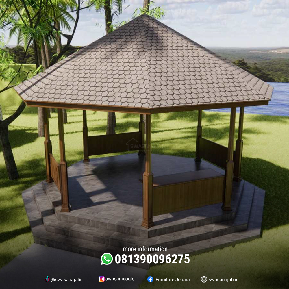 Gazebo ini cocok ditempatkan di taman pribadi, area publik seperti resort atau taman kota, maupun pelengkap arsitektur tradisional pada rumah adat atau bangunan budaya. Kombinasi antara bentuk geometris modern dan unsur tradisional menjadikannya tempat beristirahat yang tidak hanya nyaman, tetapi juga sarat makna budaya.