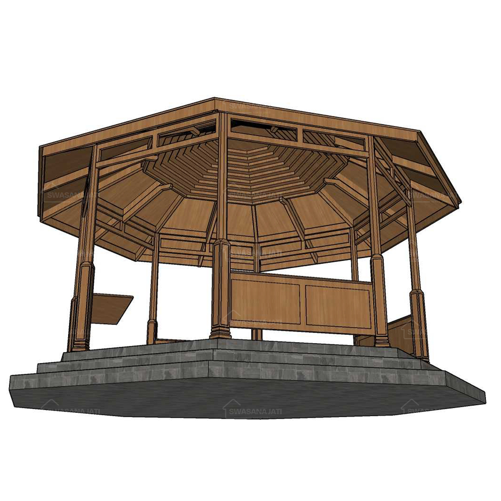 Gazebo ini mengusung desain segi delapan (oktagonal) yang unik dan elegan, dipadukan dengan arsitektur tumpangsari, ciri khas bangunan tradisional Jawa yang kaya nilai estetika dan filosofis. Bentuk segi delapan memberikan kesan simetris dan harmonis dari semua arah pandang, menciptakan struktur yang kokoh namun tetap ringan secara visual.
